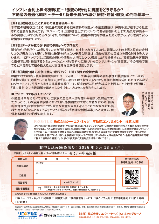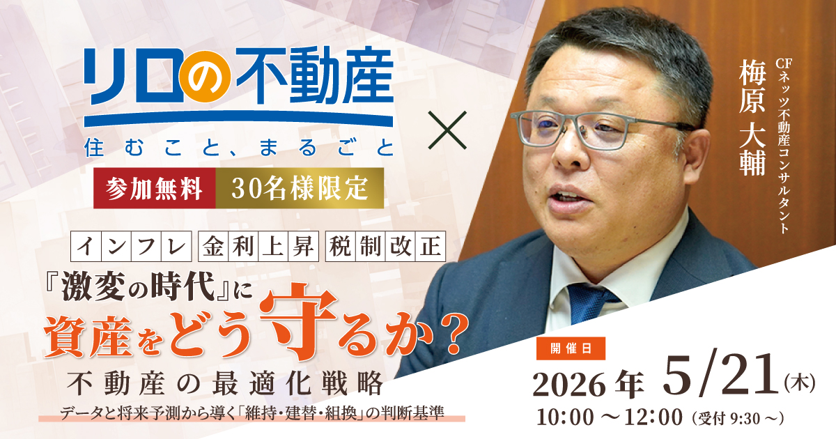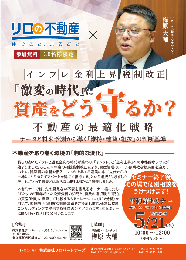 リアルセミナー『インフレ・金利上昇・税制改正・・・「激変の時代」に資産をどう守るか?不動産の最適化戦略~データと将来予測から導く「維持・建替・組換」の判断基準~』を5月21日(木)に新宿にて開催致します。