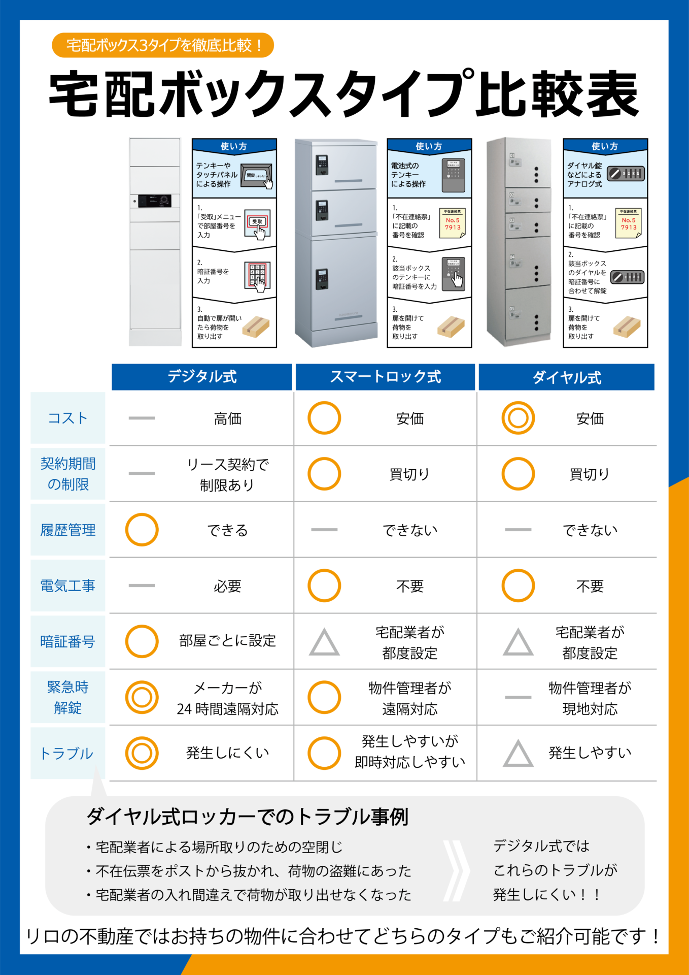 「デジタル式」と「スマートロック式」、「ダイヤル式」の違いは以下の画像よりご確認頂けます。