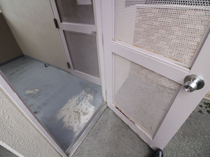 - 共用部の鉄扉の劣化が激しく、見栄えも悪い状態のため改善したい。 Before 共用部の鉄扉の劣化が激しく、見栄えも悪い状態でしたので、補修対応等も検討しましたが、大規模修繕に伴い新規で交換を検討。