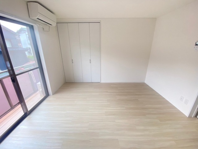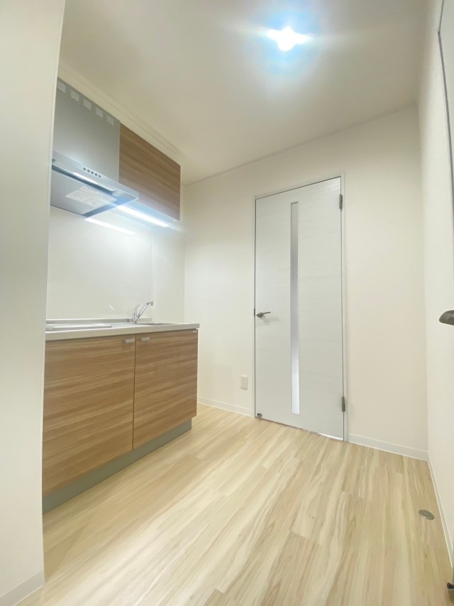 - キッチン・お風呂・エアコン・独立洗面台・ウォシュレット等の設備面を一新し、床材も明るめのカラーをご提案。建具もホワイトカラーで統一し、明るい空間を目指しました。アクセントに石目調のクロスを採用し、シンプルでおしゃれなお部屋に仕上がりました。