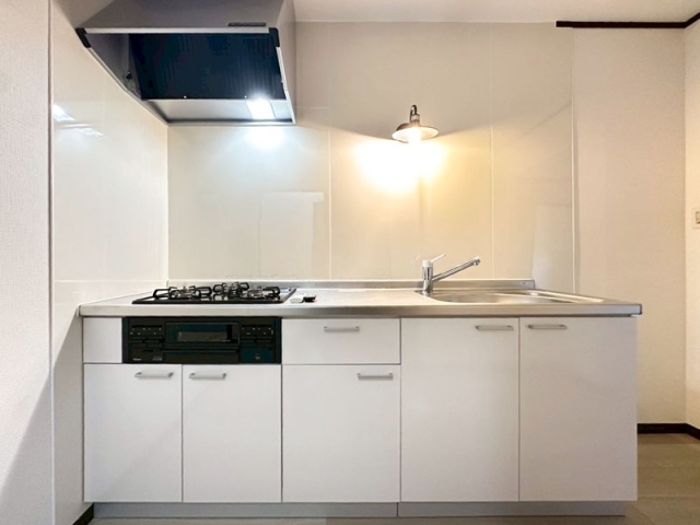 - キッチンは3口コンロのシステムキッチンへ、お風呂は混合水栓へと交換を行い、設備面の向上を行いました。また、以前は和室2部屋の3LDKの間取りでしたが、オールフローリングに変更し、家具の配置がしやすくなり、幅広い入居者様にとって使いやすい空間へと改善しています。収納には、パイプハンガーを設置し、洋服を掛けて収納できるようにすることで、日常の使い勝手を向上させました。さらに、日が当たりにくい号室であることを考慮し、明るいデザインの床材やクロスを採用し、部屋全体が明るく広く見えるようにしました。加えて、ベランダは、塗装をし直し、見た目をきれいに整えました。