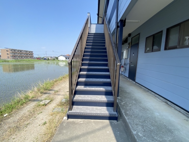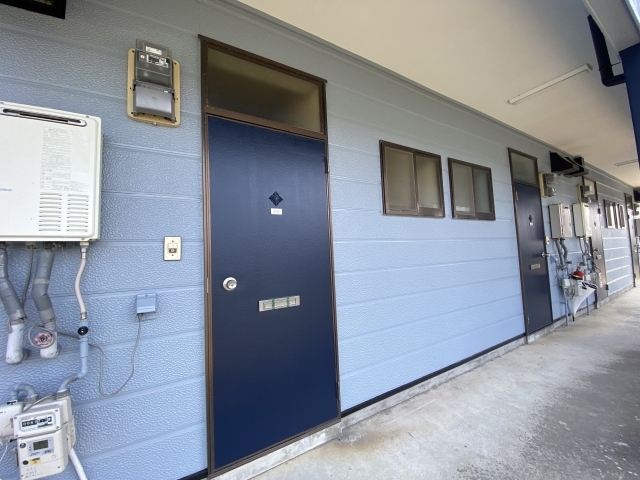 - 階段の鉄部の腐食が目立っていたため、階段・廊下には長尺シートのご提案をしました。また、エントランスのコンクリ割れがあり危険だったため、補修を行いました。外壁の色についてはオーナー様とご相談しました。オーナー様のご要望としては、汚れが目立ちにくい色にして欲しいとのことでしたので、薄いグレーをベースにネイビーをアクセントに採用し塗装を行いました。
