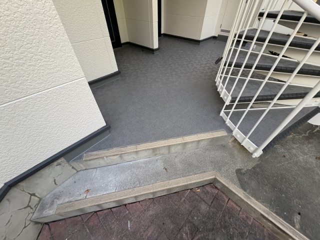 - 外壁・屋根の塗装・ひび割れの補修を行い、建物全体の印象がシックな雰囲気へとなりました。また、2027年には蛍光灯の製造が終了することから、共用灯をLEDへ変更を行う提案を行い、長持ちする明るい照明へと生まれ変わりました。さらに、階段などにシート施工を行い、安全性を高めました。