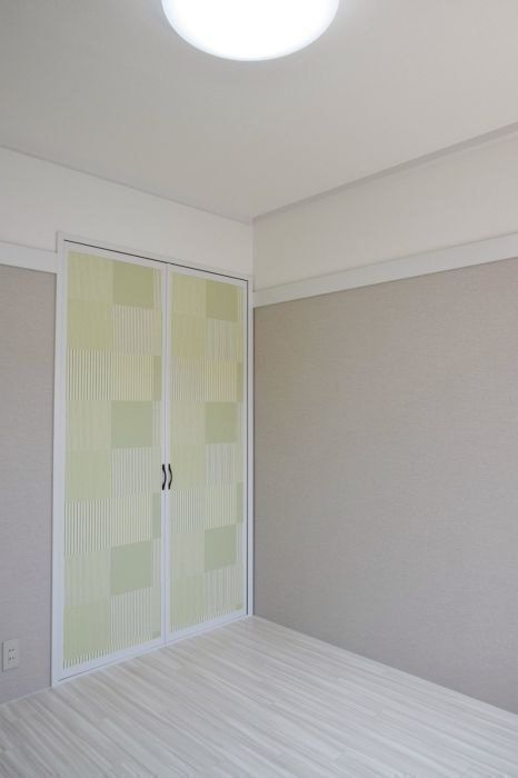 和室を北欧風へと劇的にコンバージョンした事例です。若い世代のニーズに応えるため、畳から床材への変更に留まらず、床下の根太から丁寧に補修し機能性を追求しました。収納はクローゼットに変更し、LED照明を新設しています。淡いグリーンをアクセントにしたトータルコーディネートが、視覚的な広さと快適さを演出しており、和室の面影を感じさせない、モダンな空間に生まれ変わりました。