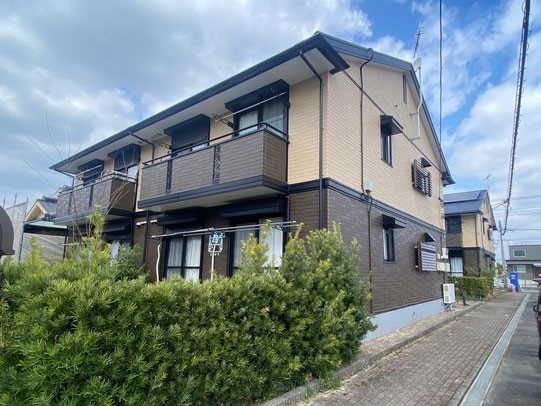 大規模修繕外壁塗装築32年の外壁を汚れが目立ちにくい色に塗装。柱基礎も修理し、アパート名にちなんだデザイン看板で一新!